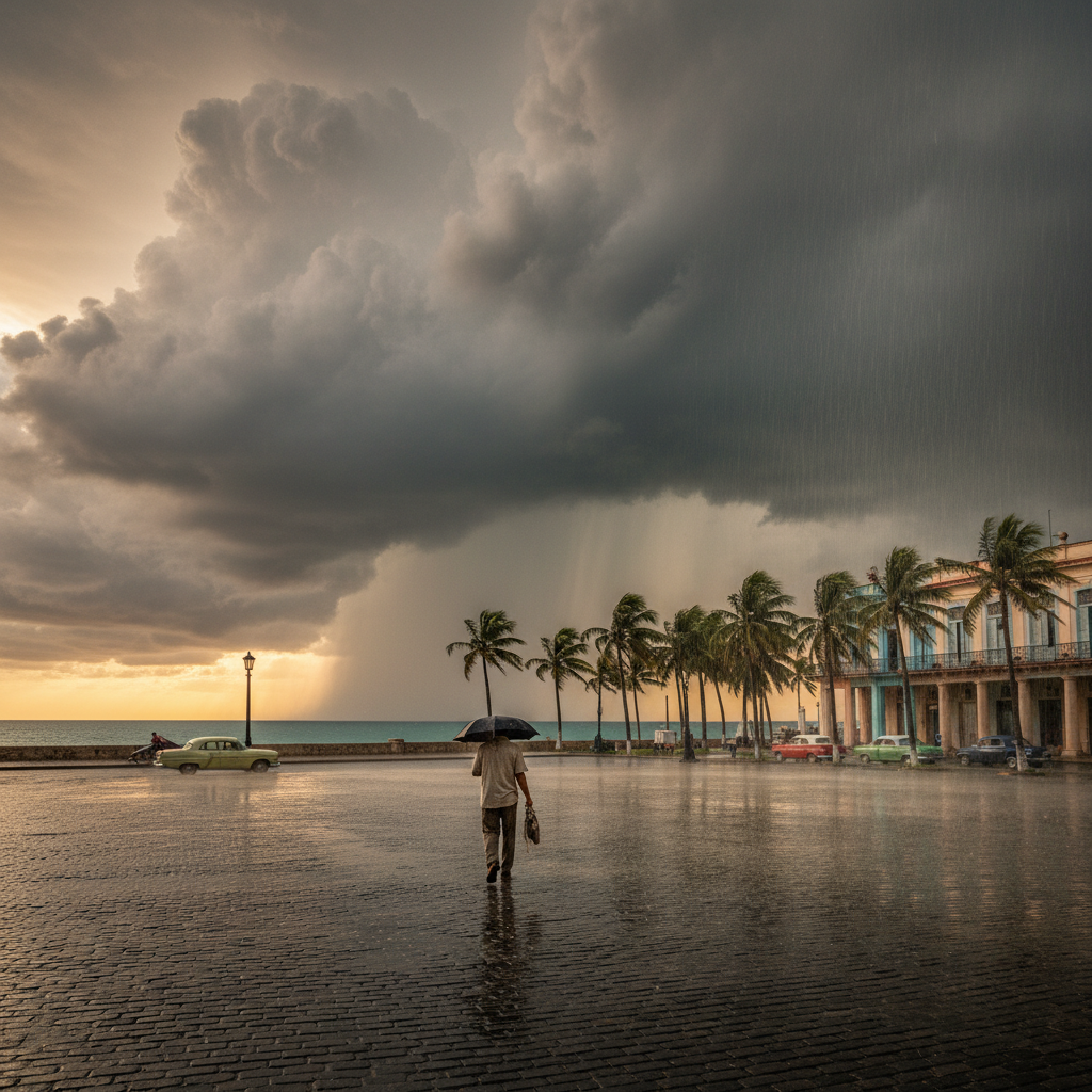 Matter-of-fact and blunt, he calls out the rhythm of Cuban weather: relentless humidity, high temperatures year-round, and wet-season thunderstorms that can turn sun into deluge in minutes. He doesn't romanticize it — he shows how the city's colonial streets steam, shine, and flood when tropical cells roll in.